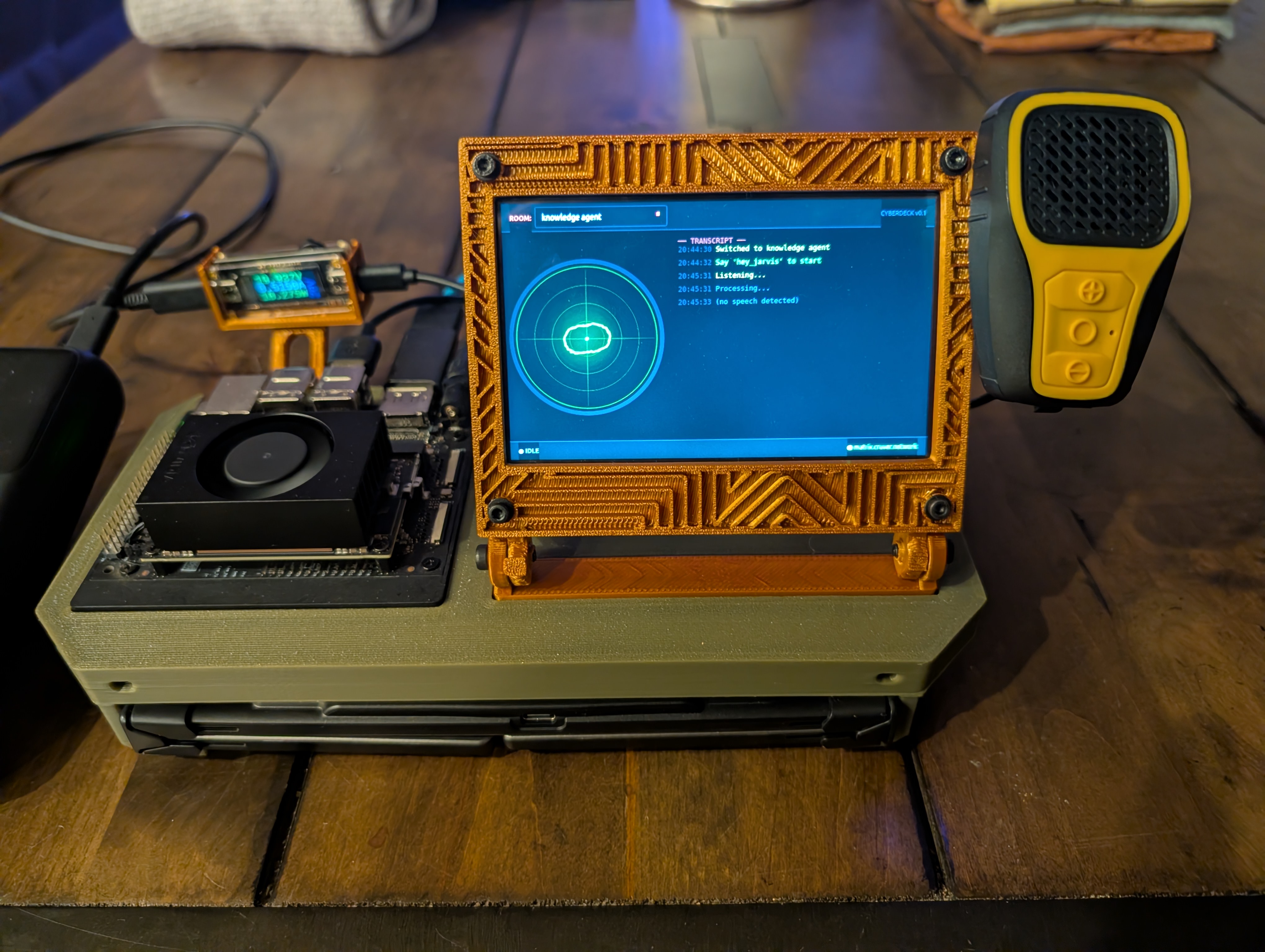 It’s fully assembled and working. I used FreeCAD to design and 3D print a housing that holds the Jetson Orin Nano, the ELECROW screen, and the USB-C trigger board. The voice pipeline works, the oscilloscope display looks cool, and I can send Matrix messages by talking to it. The only remaining task is adding handles to the enclosure for easier carrying.